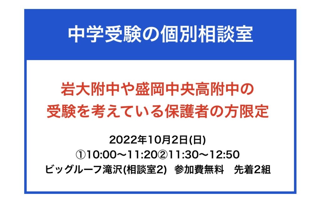 個別相談室では、岩大附中や盛岡中央高附中に合格するための受験対策(勉強法や学習計画など)に関することだけでなく、進学後の学習面でのメリットやデメリットについてもお話します。