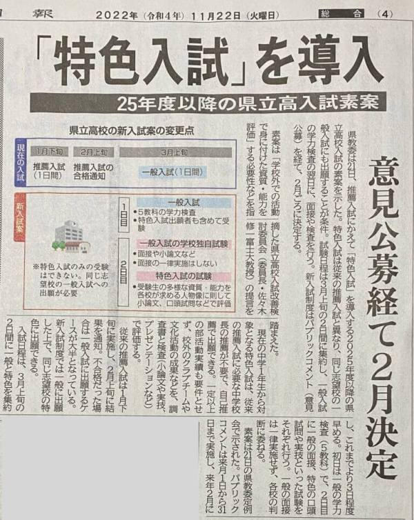 個人的には「これまでの推薦入試(部活推薦)を廃止するのは賛成だが、この特色入試は…?何のためにやるのかよく分からない。」というのが率直な感想で、これでいいのか?という疑問を抱いています。