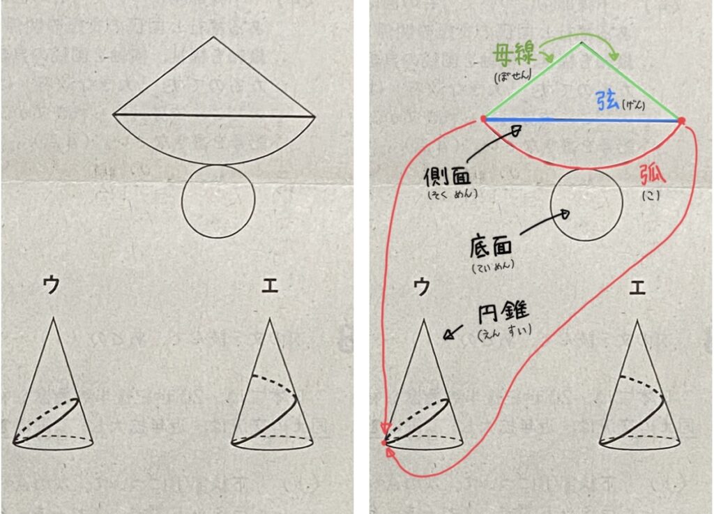 たいていの問題は円錐の見取り図から展開図に線を描くのですが、今回の問題が逆のパターンでした。