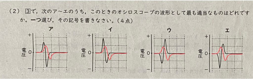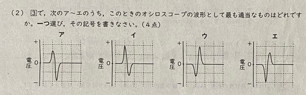 実験2で、次のア〜エのうち、このときのオシロスコープの波形として最も適当なものはどれですか。一つ選び、その記号を書きなさい。