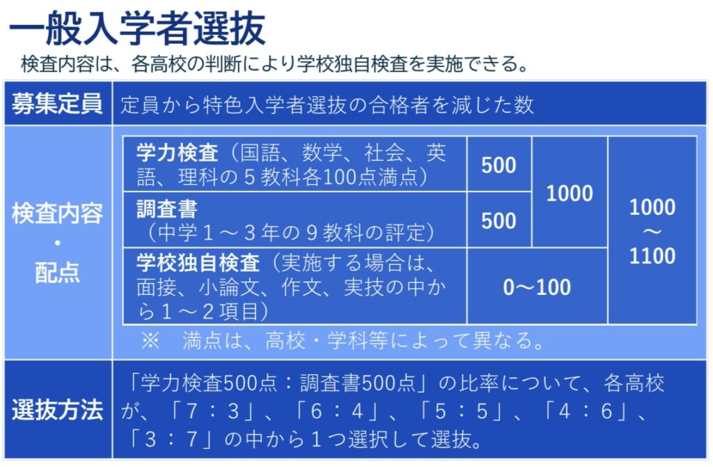 一般入試 = 学力検査、調査書(必修)+ 学校独自検査(任意)